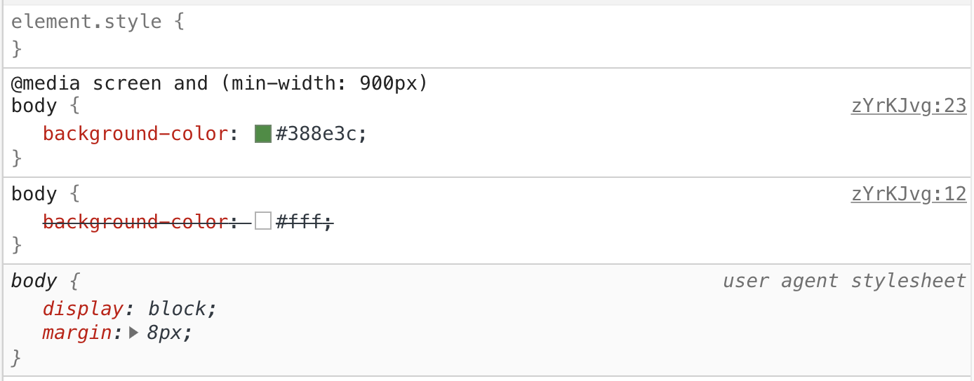 Таким чином в інструментах розробника будуть виглядати стилі елемента <body> при ширині в'юпорту більшої за 900px.